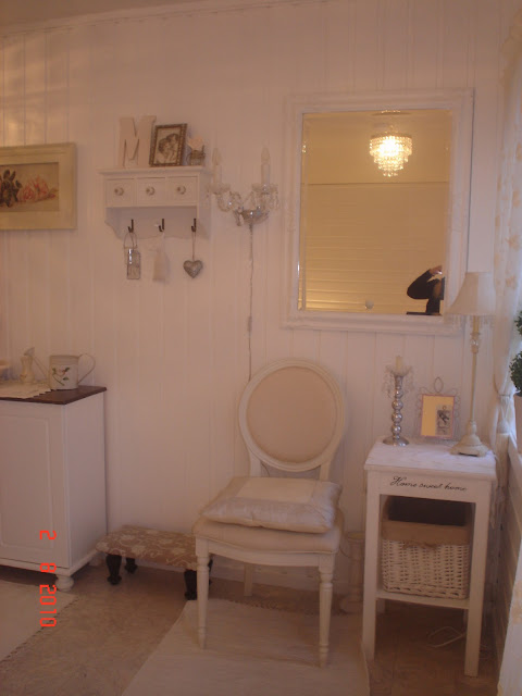 hei jenter..har i et tidligere innlegg lovet å vise dere loftsgangen..og her er den..panelet er malt i hvitt og vi har kledd igjen en dør.har hengt opp 2 lysekroner i taket og en prismelampe på veggen.hylla har jeg funnet på skeidar idag,har pyntet den og skiftet til porselenknotter.her er resultatet..ønsker alle som er innom en fin kveld.klemmer fra åshild