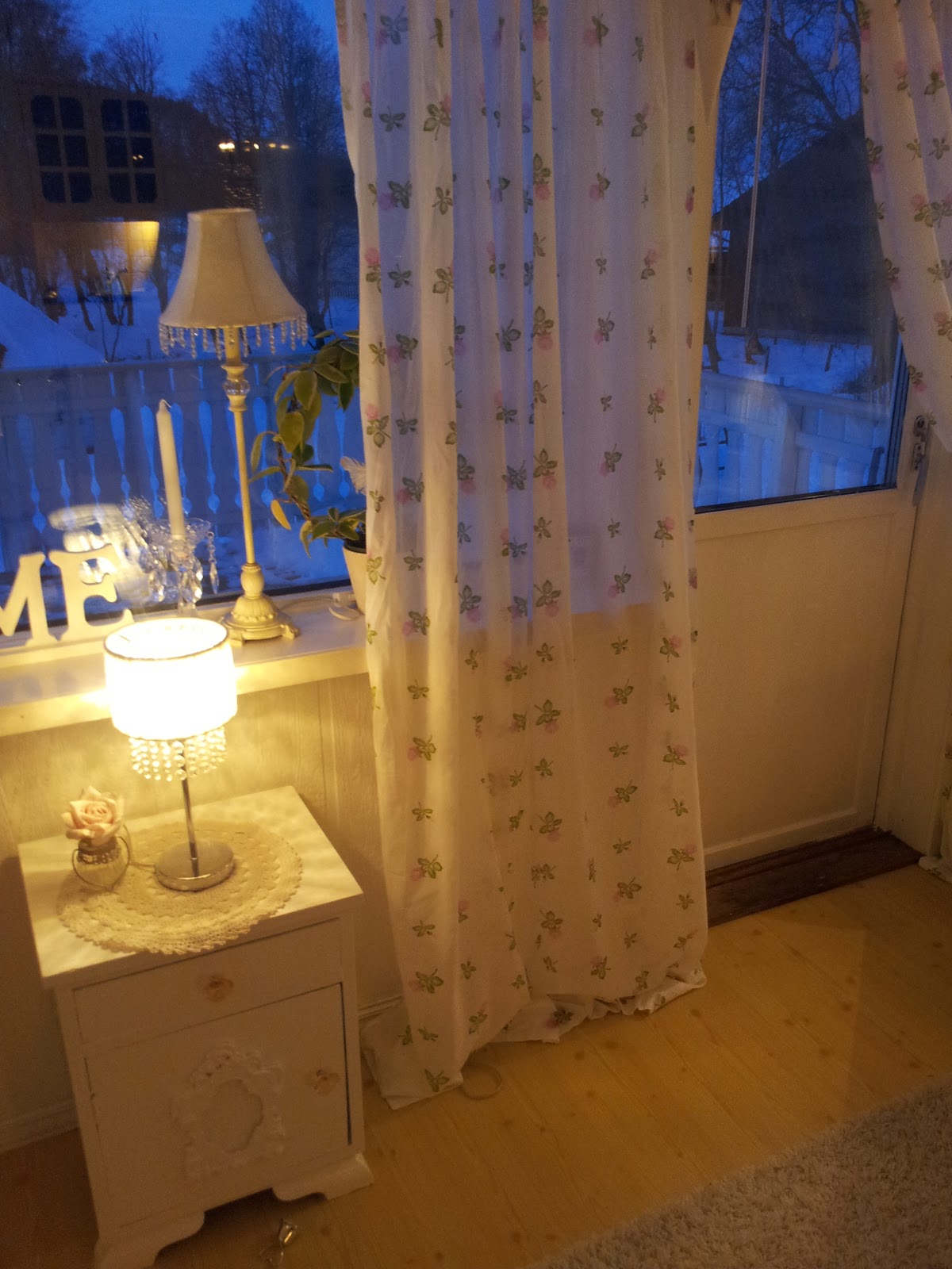 hei.idag har jeg skitet gardiner i stua,savner vår og sommer ,så tenkte å få vårstemning i stua,med hvite nyanser og pastellfargede roser..gardinene har jeg funnet på princess..synes de var så søte...